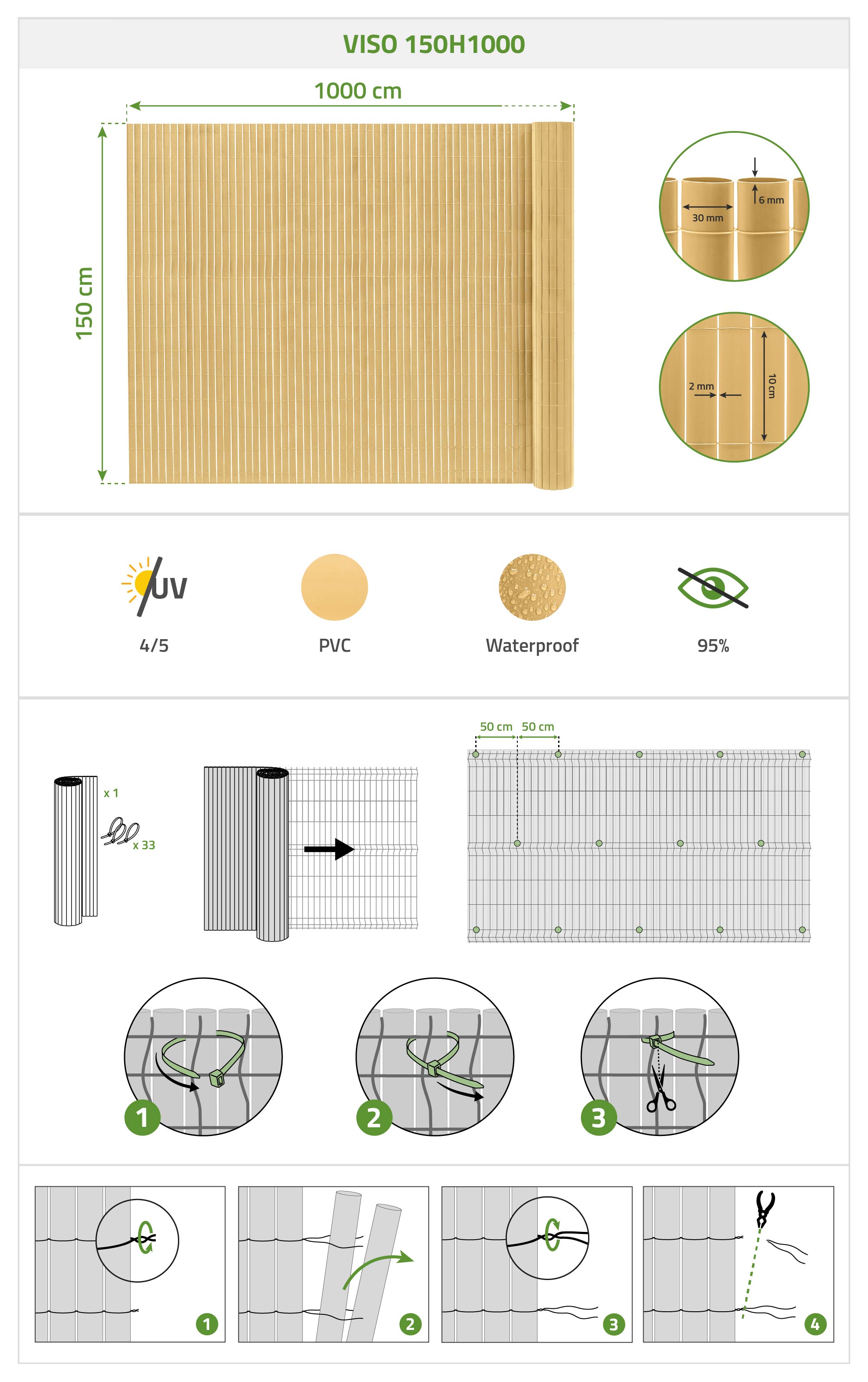 Escolha a tela de PVC com ripas VISIO, projetada para oferecer 95% de privacidade graças às suas ripas de 30 mm de largura. Sua alta densidade de 1,6 kg/m² confere resistência e durabilidade perfeitas, mesmo em condições climáticas adversas. Robusta e altamente resistente aos raios UV, ela mantém sua cor e estilo ao longo do tempo, para um espaço externo privativo e bem cuidado durante todo o ano. As ripas da tela de PVC com ripas VISIO são firmemente unidas por arame revestido de polietileno (PE). Este sistema de fixação oferece maior durabilidade e um acabamento mais refinado do que modelos que utilizam fio de nylon ou cola. Também permite ajustar facilmente o comprimento da tela para se adequar à configuração do seu espaço externo.